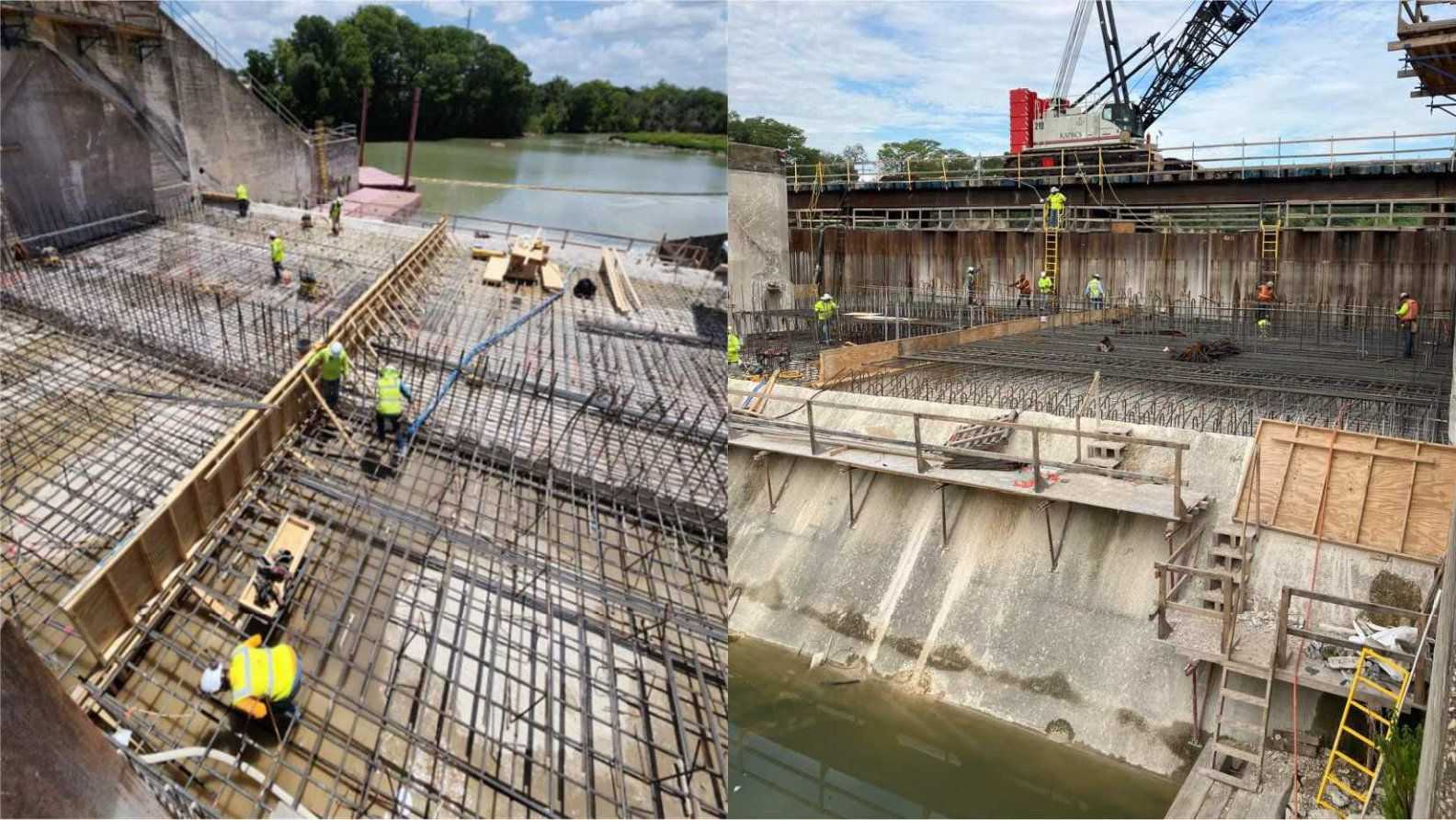 - Bay 1 – Install dowels, rebar, hinge anchors, stop log block outs and formwork for slab to elevation 510.50